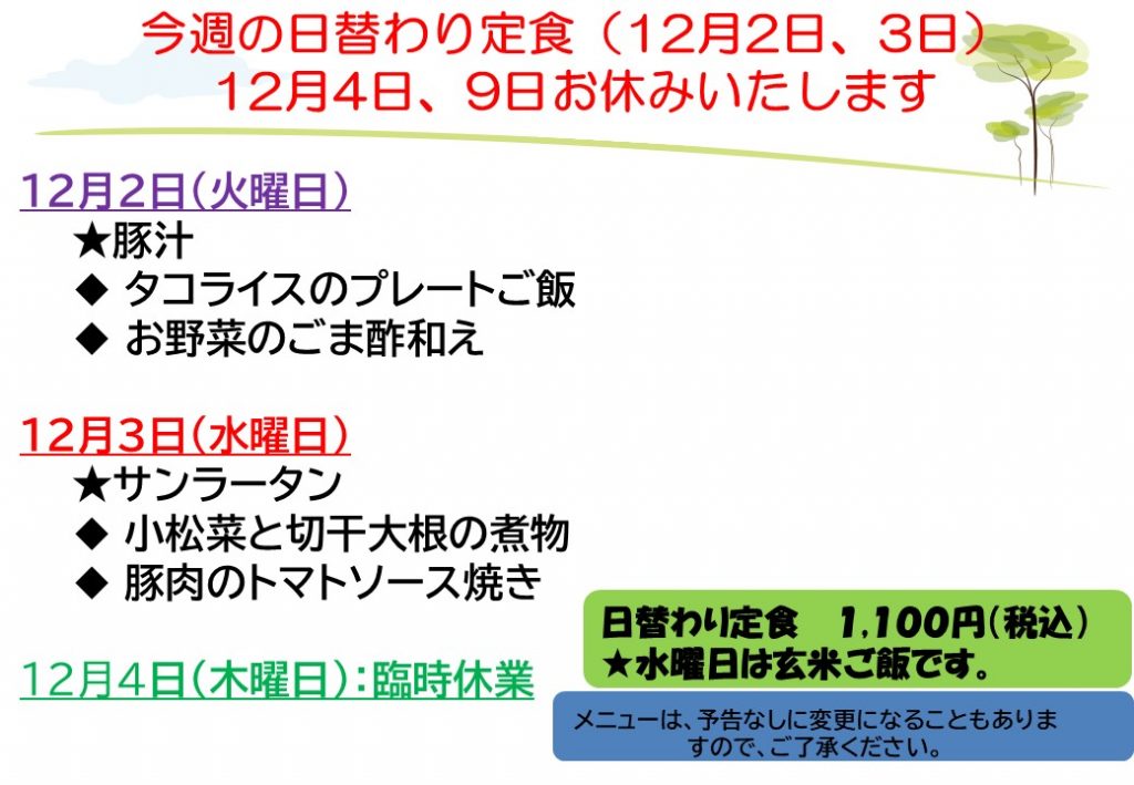 12月4日(木曜日)、12月9日(火曜日)は臨時休業です